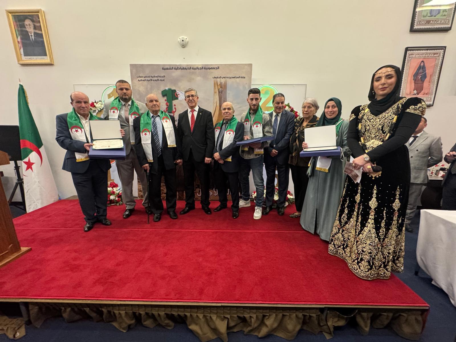 وشهد الحفل تكريم عدد من أبناء الجالية تقديراً لمساهماتهم المتميزة، وتم تقديم مأكولات ومشروبات وحلويات جزائرية تقليدية وتنصيب خيمة كبيرة خُصصت لتقديم الشاي، تعبّر عن ثراء المطبخ الجزائري وأصالته. وتخلل الأمسية أيضاً عرض فني موسيقي، إلى جانب عرض صور وفيديوهات توثّق لمحطات الثورة التحريرية والإنجازات الوطنية بعد الاستقلال، في مشهد أعطى للمناسبة طابعاً احتفالياً أصيلاً وجسّد عمق انتماء الجالية الجزائرية لوطنها الأم وفخرها بالهوية الوطنية واعتزازها بتاريخها المجيد.