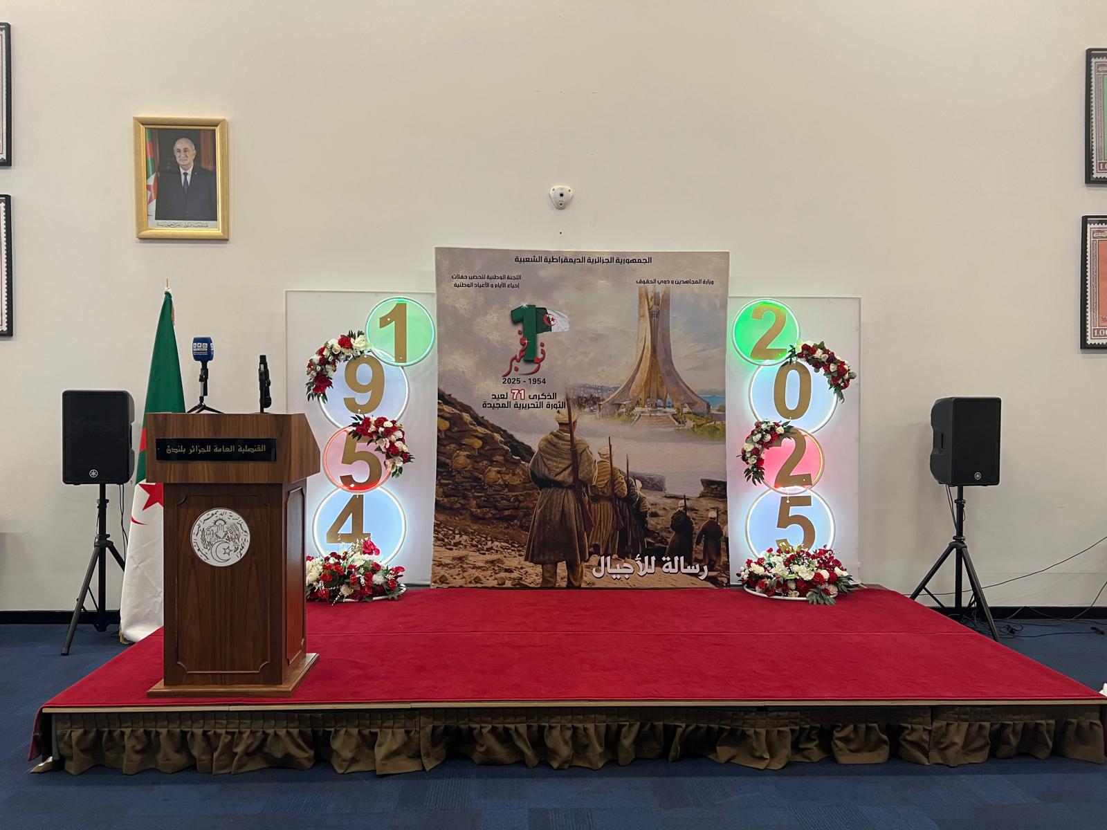 استُهل الحفل بعزف النشيد الوطني ووقفة ترحم على أرواح شهداء الثورة الأبرار، أعقبها إلقاء السيد القنصل العام كلمةً أكد فيها على المعاني السامية لثورة أول نوفمبر ودلالاتها التاريخية الخالدة، مبرزاً التضحيات الجسيمة التي قدّمها الشهداء والمجاهدون من أجل تحرير الوطن، ومشيراً إلى مسيرة البناء والتنمية التي تشهدها الجزائر الجديدة في ظل قيادتها الرشيدة. كما نوّه بدور الجالية الجزائرية في الخارج في تعزيز صورة الوطن في محيطها والمساهمة في مسيرة التطور الوطني، مع الإشادة بالعمل البطولي الذي قام به المواطن الجزائري سمير زيتوني.