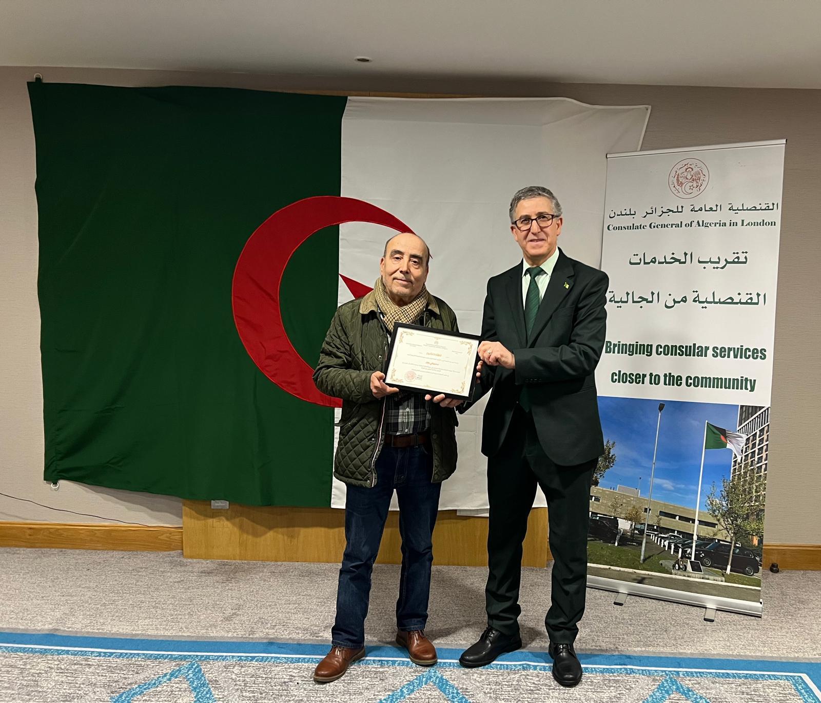 وفي إطار هذه العملية، تم تكريم السيد علال مخفوظي، الذي يقيم في بلفاست منذ سنة 1981، تقديرًا لعطائه المستمر وخدماته القيّمة للجالية الجزائرية، واعترافًا بتعاونه الدائم مع القنصلية العامة.