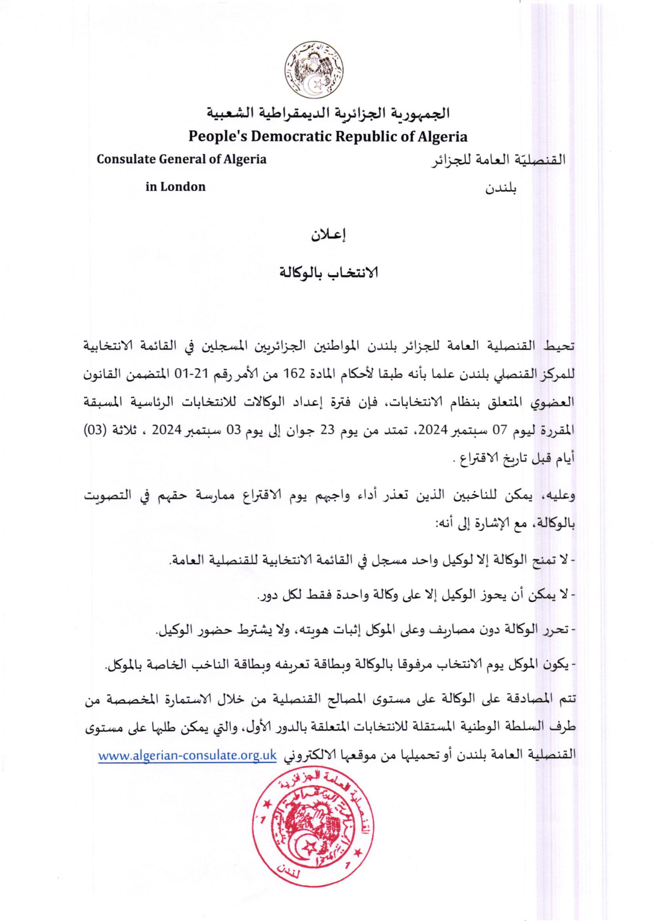 The Consulate General of Algeria in London will be closed on Saturday 1st November 2025